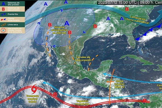 La depresión tropical Tres-E, que se formó ayer, evolucionó hoy 12 de julio de 2023 a la tormenta Calvin en el Océano Pacífico, informó la Comisión Nacional del Agua (Conagua); aquí puedes seguir su trayectoria en vivo.