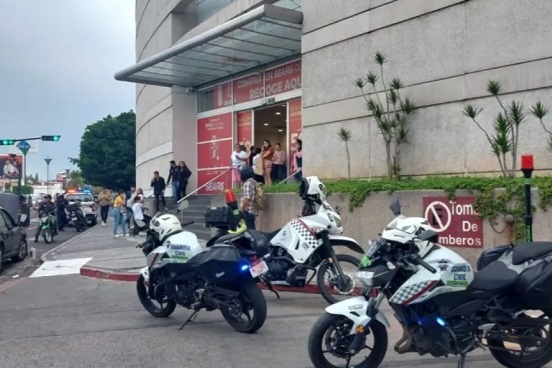 Videos en redes sociales registraron el momento en que policías corren al interior de la plaza, mientras establecimientos permanecen con las cortinas abajo.