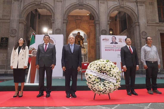 En el acto protocolario estuvo acompañado por el gobernador de Oaxaca, Salomón Jara Cruz; el jefe de Gobierno de la Ciudad de México, Martí Batres Guadarrama; la secretaria de Gobernación, Luisa María Alcalde Luján y el presidente municipal de Guelatao de Juárez, Aldo González Rojas.
