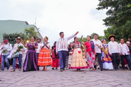 El Gobernador Salomón Jara Cruz, la presidenta del Sistema para el Desarrollo Integral de la Familia, Irma Bolaños Quijano, la Diosa Centéotl Leticia Santiago Guzmán, la titular de la Secretaría de Turismo del Estado de Oaxaca, Saymi Pineda Velasco, así como el funcionariado del Gobierno del Estado encabezaron el alegre y festivo recorrido desde la Fuente de las Ocho Regiones a la Alameda de León.