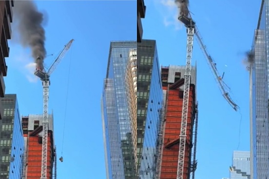 En redes sociales se difundieron videos en los que se aprecia cómo la parte superior de la grúa se parte y cae al suelo, rozando un edificio cercano en su caída. Al mismo tiempo, se ve fuego y humo saliendo de la cabina de la grúa.