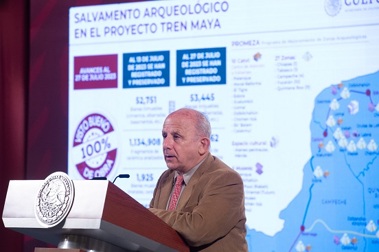Diego Prieto, director general del Instituto Nacional de Antropología e Historia (INAH), presentó esta mañana en Palacio Nacional su informe respecto a la recuperación de bienes inmuebles por las obras del Tren Maya, resaltó que hasta el momento se han preservado 53 mil 445.