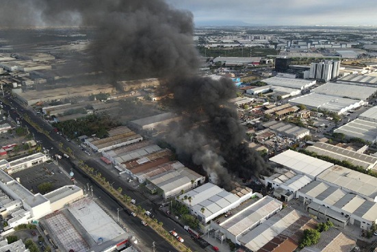 En Apodaca, Nuevo León, un incendio consume la madrugada de hoy 3 de agosto de 2023 diversas bodegas con plástico y madera, por lo que la columna de humo negro es perceptible a varios kilómetros.