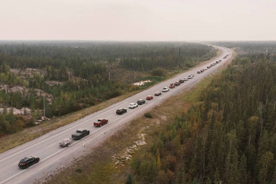 Miles de personas a las que se les ordenó huir de los incendios forestales que avanzan en el extremo norte de Canadá se agruparon este jueves en un aeropuerto local para abordar vuelos de evacuación, mientras una larga fila de autos se dirigía al sur en la única carretera abierta para ponerse a salvo.