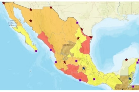 Estos son: Colima, Guerrero, Michoacán, Sinaloa, Tamaulipas y Zacatecas, destinos donde se asientan cárteles del narcotráfico. Incluso en el mapa interactivo aparecen en color rojo.