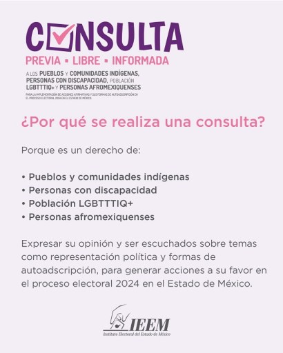 El Instituto Electoral del Estado de México (IEEM) llevará a cabo, en los próximos días, la Consulta Previa, Libre, e Informada. Esta iniciativa tiene como propósito fundamental recabar las perspectivas de personas pertenecientes a pueblos y comunidades indígenas, con discapacidad, miembros la comunidad LGBTTTIQ+ y las personas afromexiquenses, de cara al proceso electoral de 2024.