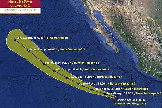 Jova pasó de ser una tormenta a convertirse en huracán durante la madrugada de hoy 6 de septiembre de 2023 y horas más tarde alcanzó la categoría 2 en el Océano Pacífico, frente a costas de Jalisco.