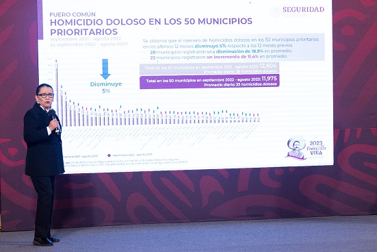 Agregó que en Guanajuato van tres meses a la baja; en el estado de México también va a la baja ese delito; en Jalisco llevan tres meses decrecientes; y en Michoacán “es un caso importante porque van 17 meses con tendencia a la baja, con el gobierno anterior se presentaron (al cerrar) 273 homicidios, mientras que en agosto pasado fueron 138”.
