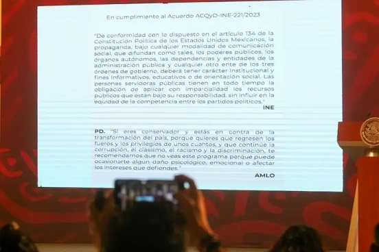 En el párrafo ordenado por el INE se advierte que con base en el artículo 134 constitucional la propaganda que bajo cualquier modalidad realicen cualquiera de los poderes públicos, organismos autónomos, dependencias y entidades de la administración pública “deberá tener fines informativos, educativos o de orientación social. Las personas servidoras públicas tienen en todo tiempo la obligación de aplicar con imparcialidad los recursos públicos que están bajo su responsabilidad, sin influir en la equidad de la competencia de los partidos políticos”.