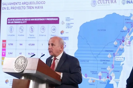 Prieto también dio a conocer los avances en las tres zonas arqueológicas que están a lo largo del Tramo 1 del Tren Maya: Palenque, Moral Reforma y El Tigre.