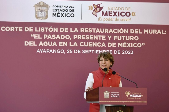 Al asistir a la inauguración de la restauración del mural “El pasado, presente y futuro del Agua en la Cuenca de México”, la Gobernadora Delfina Gómez destacó que este mural, creado en el año 2010 por Abraham Rodríguez y Aurora Moctezuma, es una obra que invita a valorar y reflexionar sobre el cuidado del agua.