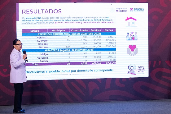 Como parte de su informe quincenal en Palacio Nacional, Rosa Icela Rodríguez Velázquez, secretaria de Seguridad y Protección Ciudadana (SSPC) anunció que en los últimos dos años, el programa del Tianguis del Bienestar ha entregado ya a las familias más pobres del país, 9.7 millones de bienes y artículos nuevos decomisados a la delincuencia.