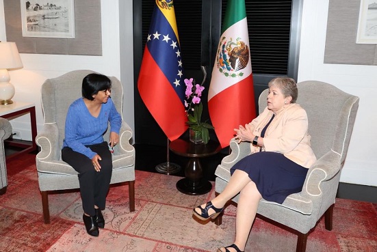 “Desde Caracas con @delcyrodriguezv celebramos que se retome el proceso de diálogo y negociación que se firmó en México y que se llevará a cabo mañana en Barbados entre el Gobierno y la Plataforma Unitaria en presencia de México”, publicó Bárcena.