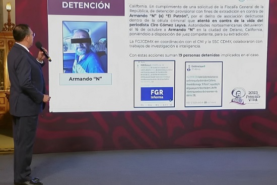 “En cumplimiento de una solicitud de la Fiscalía General de la República, de detención provisional con fines de extradición en contra de Armando “N”, alias El Patrón, por el delito de asociación delictuosa dentro de la célula criminal que atentó en contra de la vida del periodista Ciro Gómez Leyva”, dijo el funcionario.