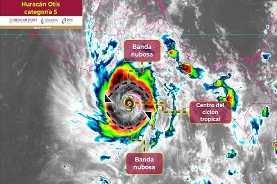 El huracán Otis ya es categoría 5 con vientos de 260 km/h y se ubica a 90 km al sur-sureste de Acapulco y a 125 km al oeste-suroeste de Punta Maldonado, Guerrero,