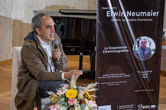 En un acto que reunió a estudiantes, docentes y amantes del cine, el director general de Estudios Churubusco, Erwin Neumaier, impartió una clase magistral en la Escuela de Artes Escénicas de la Universidad Autónoma del Estado de México (UAEMéx). Bajo el título «La experiencia cinematográfica», el evento contó con la presencia de la secretaria de Difusión Cultural de la UAEMéx, María de las Mercedes Portilla Luja, y se llevó a cabo en el auditorio del Edificio de Vientos de la universidad.