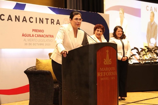 La presidenta de la Mesa Directiva de la Cámara de Diputados, Marcela Guerra Castillo, y 25 integrantes más de la LXV Legislatura fueron galardonados con el Premio «Águila Canacintra al Mérito Legislativo», que otorga la Cámara Nacional de la Industria de Transformación.