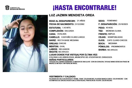 La joven desapareció el pasado 25 de octubre, tras abandonar la tienda departamental de la zona, donde laboraba. “Salió del trabajo pero nunca regresó a casa”, dijo Josefina Orea Cantú, madre de Jazmín.