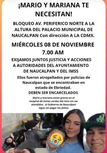 «Mario y Mariana te necesitan. Ellos fueron atropellados por policías de Naucalpan que se encontraban en estado de ebriedad. Deben ser encarcelados. Mario y Mariana están graves en el hospital de lomas verdes del IMSS sin ser atendidos”, se lee en la imagen.