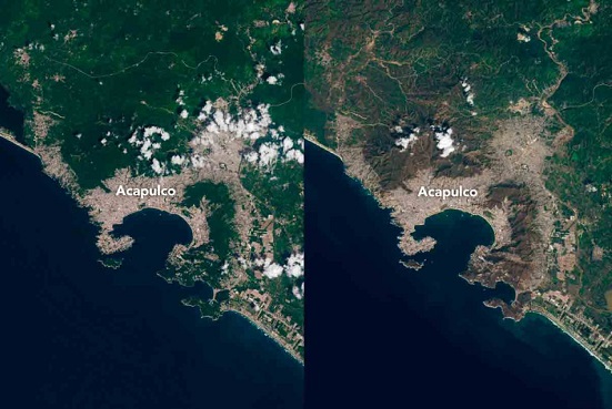 En medio del desastre, la NASA reveló una serie de imágenes satelitales en donde realiza una interesante comparación del antes y después de esa ciudad costera ante el paso del meteoro, y en donde muestra la pérdida de vegetación que afectó los alrededores de este destino de playa.