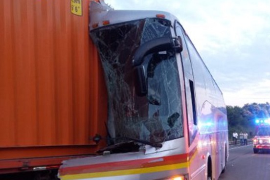 En el lugar se observó el frente del autobús incrustado en la retaguardia de los contenedores del tráiler.