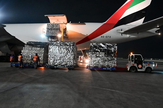 Las vacunas llegaron al Aeropuerto Internacional Felipe Ángeles en un vuelo de Emirates, según se observa en el video compartido en la cuenta @SSalud_mx.