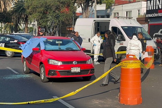El automóvil de color rojo con placas M08-AYT de la Ciudad de México fue acordonado con cinta amarilla para preservar el lugar del crimen.