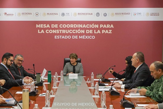 TOLUCA, Estado de México.- Fiel a su compromiso de trabajar por la seguridad del pueblo mexiquense y apoyarlo en su anhelo de una vida mejor y más justa, la Maestra Delfina Gómez Álvarez, Gobernadora del Estado de México, encabezó este día la Mesa de Coordinación para la Construcción de la Paz número 43 en Palacio de Gobierno, en Toluca.