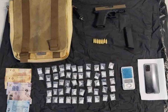 Tras una revisión precautoria, se le encontraron un arma corta abastecida con ocho balas; 52 dosis de una sustancia similar a la droga conocida como cristal, una mochila, dinero en efectivo, dos celulares y una báscula digital.