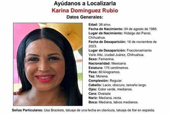 Karina, de 38 años de edad, es madre soltera y ha dedicado parte de su actividad a promover una vida libre de violencia para las mujeres en esta frontera con El Paso, Texas, y de acuerdo a información de la Fiscalía de Chihuahua, desapareció el pasado 16 de noviembre en el fraccionamiento Valle Alto, de Ciudad Juárez.