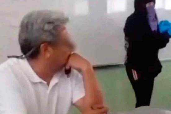 El fin de semana pasado se difundió en redes sociales como el maestro sentado en su escritorio es acusado por una joven vestida de negro y encapuchada de acosar maestras, alumnas y hasta amenazarlas.