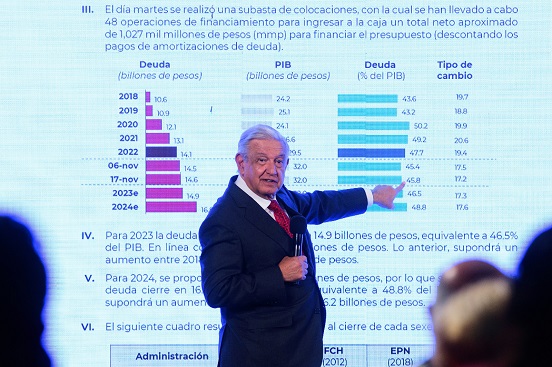 Explicó que esta administración recibió en diciembre de 2018 una deuda en términos nominales de 10.6 billones de pesos con un Producto Interno Bruto de 24.2 billones de pesos. Hasta el 17 de noviembre de este año, la deuda está ubicada en 14.6 billones de pesos, con un PIB de 32 billones de pesos, como resultado del crecimiento económico en los últimos años.
