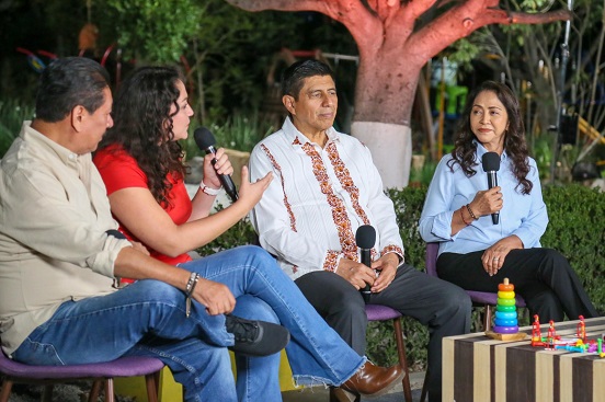 Desde las instalaciones del Centro de Autismo Nyela To Bidao, abrazando a la niña y al niño, acompañado de la Presidenta Honoraria del Sistema para el Desarrollo Integral de la Familia (DIF) Oaxaca, Irma Bolaños Quijano, en la mesa de análisis con periodistas en la que participaron Humberto Cruz y Karina Carranza respondió los cuestionamientos sobre el balance de acciones a un año de esta administración.