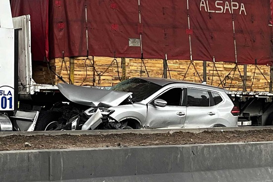 Un tráiler que transportaba varias toneladas de madera con razón social ALSAPA prensó a una camioneta contra el muro de contención.
