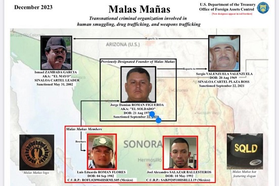 Adicionalmente a Malas Mañas, OFAC también sancionó a dos traficantes de personas con sede en México, Eduardo Román Flores y Joel Alexandro Salazar Ballesteros que respaldan financieramente a la organización.