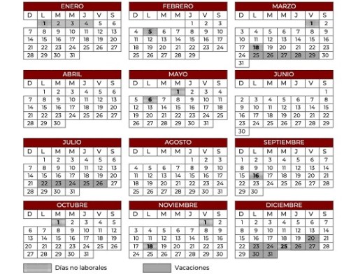De acuerdo con la Gaceta oficial, este año tendrá 11 días no laborables: el 1 de enero, 5 de febrero, por la conmemoración del aniversario de la promulgación de la Constitución Política de los Estados Unidos Mexicanos; 1 de marzo por el 2 de marzo, 200 aniversario de la fundación del Estado de México; 18 de marzo, por el natalicio de Benito Juárez.