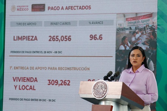 La secretaria mencionó que se establecieron tres pagos para ayudar a los damnificados por el huracán Otis. El primero fue de limpieza con un monto de 8 mil pesos en vales de enseres y canastas. Para este apoyo se registró a 274 mil 501 beneficiarios con una inversión social de 2 mil 136.6 millones de pesos, el cual fue entregado en el periodo del 29 de noviembre al 8 de diciembre a 265 mil 56 personas, lo que representa un avance del 96.6%.