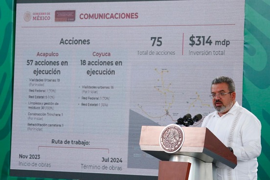 En la reconstrucción del Puerto de Acapulco y Coyuca de Benítez, el Gobierno de México, a través de la Secretaría de Infraestructura, Comunicaciones y Transportes (SICT), ha realizado 75 acciones de recuperación con una inversión de 314 millones de pesos, tras el paso del huracán Otis, además de la coordinación del puente humanitario aéreo y terrestre con que se apoyó a la población afectada.