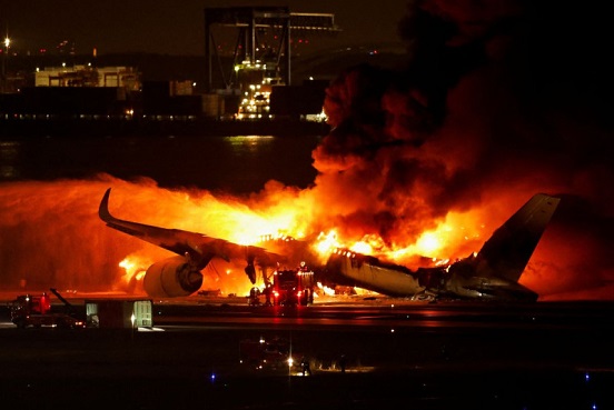 Los 379 pasajeros y la tripulación de un avión de Japan Airlines escaparon milagrosamente de un incendio tras una colisión con un avión de la Guardia Costera en el aeropuerto Haneda de Tokio el martes, pero cinco de los seis tripulantes del avión de la guardia costera murieron. La Guardia Costera dijo que la colisión involucró a uno de sus aviones que se dirigía al aeropuerto de Niigata en la costa oeste de Japón, para entregar ayuda a los atrapados en un poderoso terremoto que ocurrió el día de Año Nuevo y mató al menos a 48 personas.