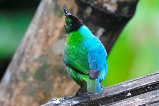 El plumaje de este mielero verde está dividido directamente por la mitad, con plumas azules típicas de los machos en el lado derecho y plumas verde esmeralda de las hembras en el lado izquierdo como prueba de su ginandromorfismo bilateral.