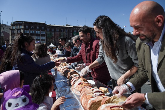 Agradeció a la Cámara Nacional de la Industria Panificadora y Similares de México (CANAINPA), por la donación de la mega rosca, de la cual fueron repartidas 15 mil rebanadas, así como a la empresa Coca-Cola FEMSA México, que aportó el mismo número de cuadritos de leche para el disfrute de los asistentes.