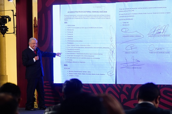 El presidente Andrés Manuel López Obrador criticó el acuerdo «mafioso» firmado por el PRI y PAN antes de las elecciones de Coahuila de 2023 en el que se reparten cargos y candidaturas y lo exhibió durante su conferencia al calificarlo como un “documento histórico”, el cual fue dado a conocer por el líder panista Marko Cortés, al quejarse del incumplimiento del mismo por parte de Manolo Jiménez, actual gobernador de dicho estado.