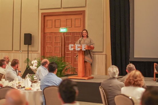 La precandidata presidencial por la alianza PAN, PRI, PRD, Xóchitl Gálvez, se reunió con empresarios de Cancún para exponer sus propuestas de gobierno y adelantó que de llegar al gobierno mantendrá en funcionamiento el Tren Maya.