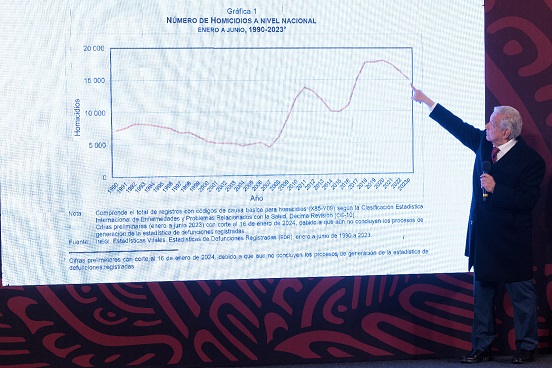 El mandatario presentó el informe preliminar de defunciones por homicidio realizado por el Instituto Nacional de Estadística y Geografía (INEGI) de enero a junio de 2023; en este se detalla una tasa de 12 homicidios por cada 100 mil habitantes a nivel nacional.
