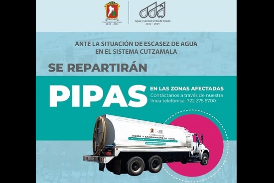El ayuntamiento pone a disposición de la ciudadanía la línea telefónica del Organismo: 722 275 5700 y las redes sociales oficiales para solicitar pipas de agua a través de estas.