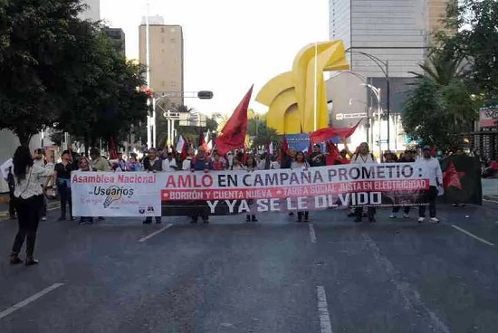 Al menos 3 mil integrantes de la Asamblea Nacional de Usuarios de la Energía Eléctrica protestaton para demandar tarifa social justa, por el derecho humano a la electricidad y solución al conflicto del Sindicato Mexicano de Electricistas (S.M.E.).