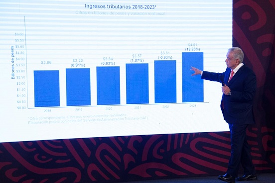 Al presentarlos, explicó que en 2018 la recaudación fue de 3 billones de pesos, y para 2023 se cerró con 4.5 billones de pesos. “O sea, en el tiempo que llevamos, cinco años, un billón 500 mil millones (más) en la recaudación”.