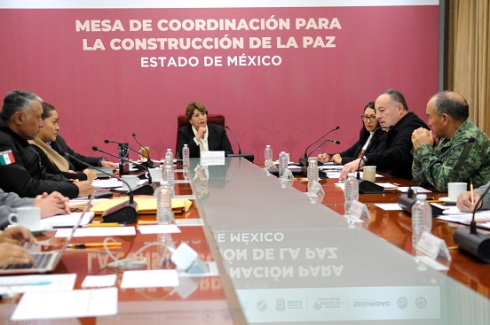 TOLUCA, Estado de México.- La Gobernadora Delfina Gómez Álvarez encabezó la Mesa de Coordinación para la Construcción de la Paz, donde destacó que se han logrado importantes resultados en el combate a los delitos por extorsión, robo a transporte público y en el aseguramiento de hidrocarburos.