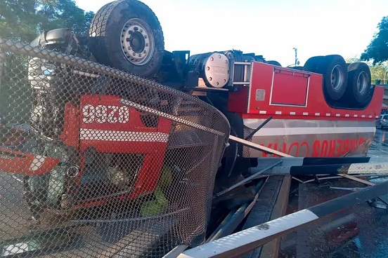Servicios de emergencia realizaron las maniobras para poner el camión de bomberos en su posición normal y liberar la vialidad.