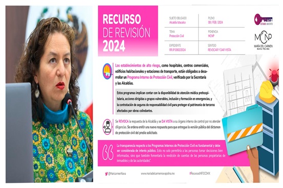 + “Se trata de información de interés público, ya que es crucial que la comunidad conozca los riesgos detectados para, en su caso, implementar medidas y acciones necesarias que garanticen la protección de la vida, la integridad y la salud de las personas”: Comisionada Ciudadana, María del Carmen Nava Polina.
